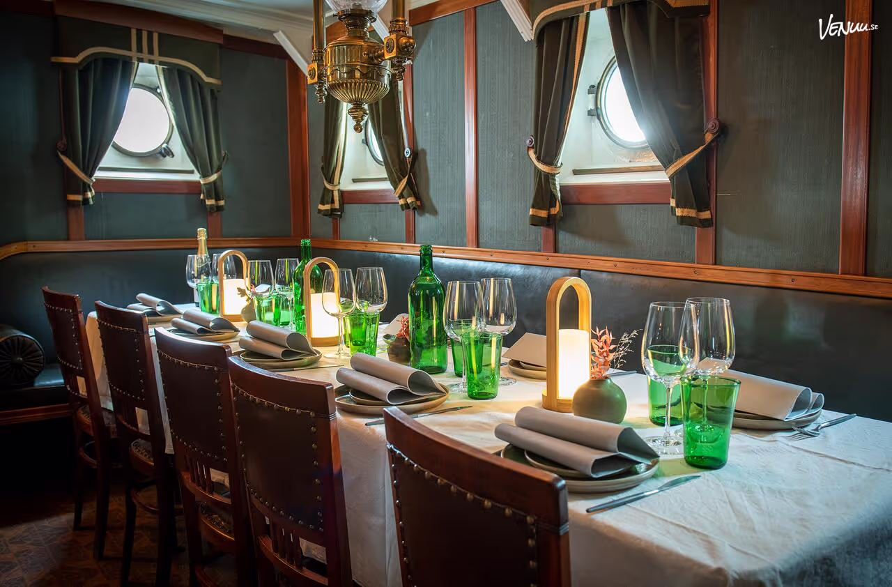 Ombord på isbrytaren Sankt Erik som ligger förtöjd på bryggan på djurgårdsstrand, finns en vacker matsal med en ljus aktersalong och två härliga soldäck.