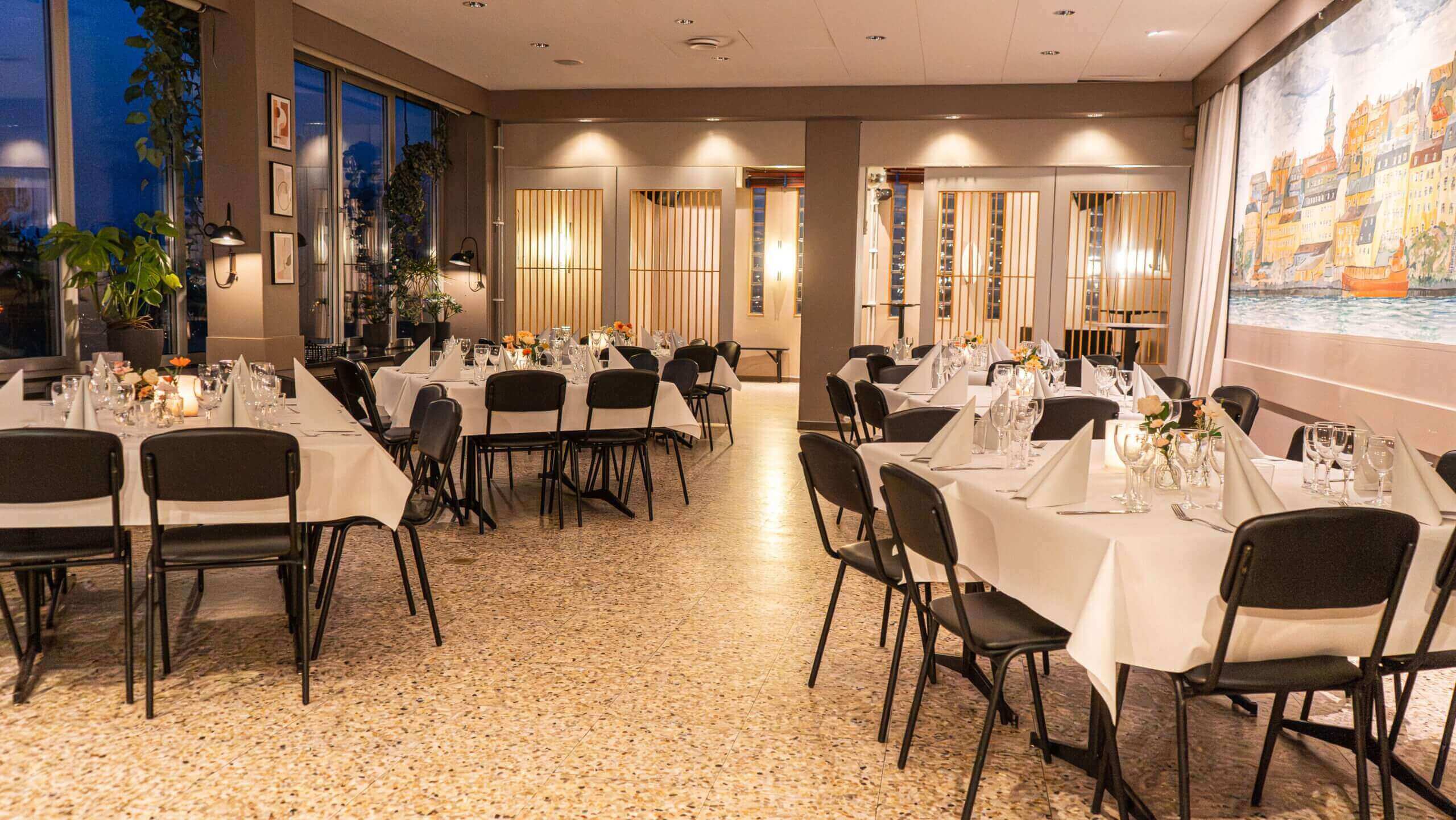 Nybohovsbackens festlokal är ljus och modern med stora panoramafönster där Stockholm breder ut sig framför er. När kvällen faller glittrar staden utanför och lokalen fylls av ett mjukt, inbjudande ljus. Här firas allt från födelsedagar och företagsfester till bröllop, disputationsmiddagar och andra viktiga tillfällen. Både privatpersoner och företag är varmt välkomna och vi har en åldersgräns på 25 år.